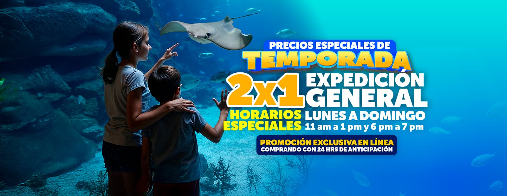 De lunes a domingo de 11:00 am a 1:00pm y 6:00 pm a 7:00 pm podrás adentrarte en una expedición submarina llena de colores vibrantes y vida fascinante.